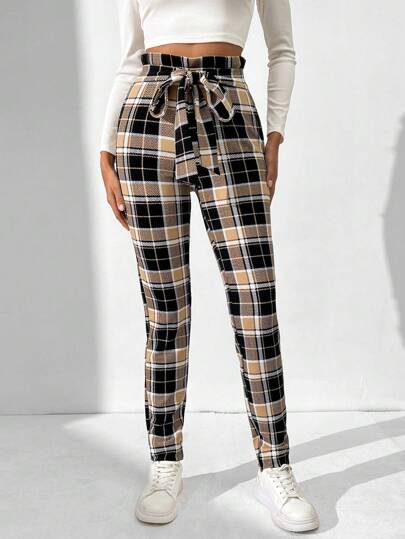 SHEIN Tall Women'S Slim Fit Plaid Pants - Khaki - View 1