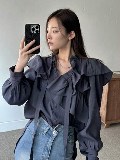 DAZY Women'S Solid Color Ruffled Edge Shirt Long Sleeve Top - Grey - View 1