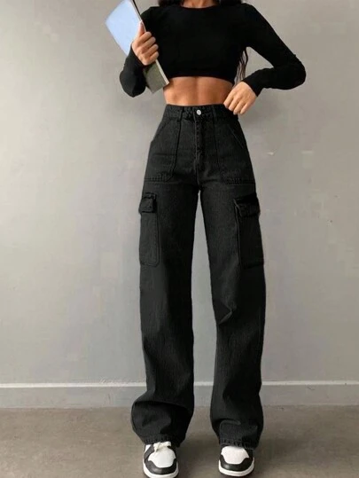 Women's American Casual Versatile Basic Mid-Rise Straight Work Jeans - Black - View 1