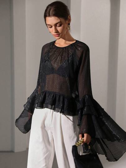 Aveloria Modichic Women's Autumn/Winter Bohemian Ruffled Glitter Chiffon Blouse - Black - View 1
