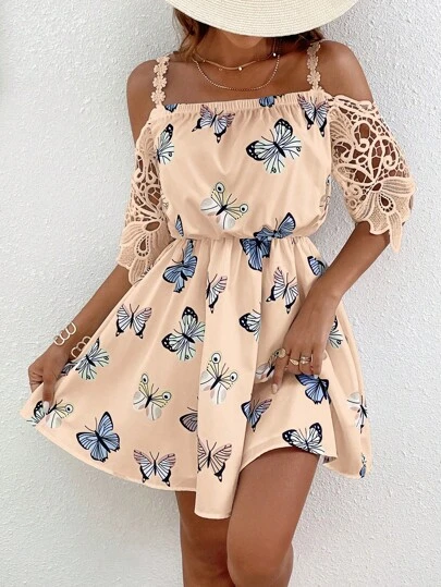 SHEIN VCAY Women's Butterfly Pattern Cutout Shoulder Dress - Multicolor - View 1
