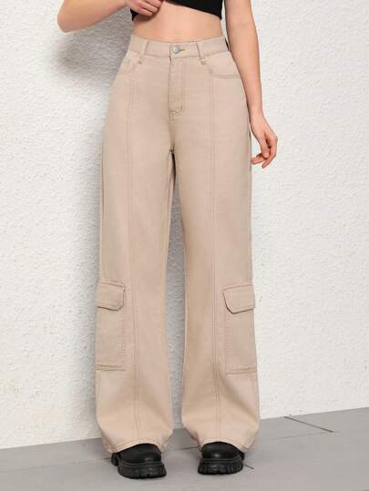 SHEIN MOD Women's Cargo Style Denim Jeans With Pockets - Apricot - View 1