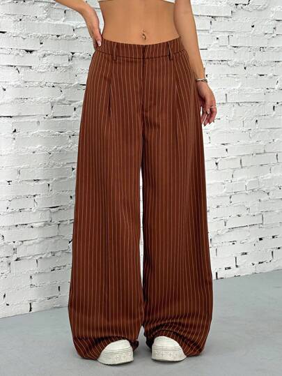 SHEIN EZwear Women's Casual Commute Striped Low Waist Wide Leg Pants - Rust Brown - View 1