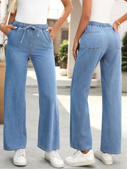 EMERY ROSE Women's Casual Drawstring Waist Slant Pocket Denim Jeans - Blue - View 1