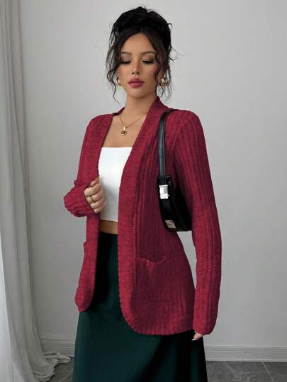 Chiquease Women's Casual Ribbed Brushed Open Front Side Pocket Shorts & Light Jacket - Red - View 6