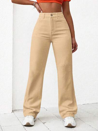SHEIN Privé Women's Casual Slim-Fit Straight-Leg Jeans With Pockets - Khaki - View 1
