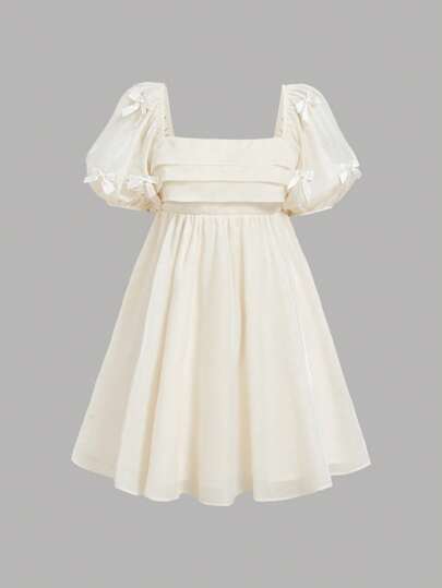 SHEIN MOD Women's Cream-Colored Mini Square Neck Bow Decor Puff Sleeve Dress,Summer Outfits,Babydoll Women Dress,Butterfly Dress - Apricot - View 1