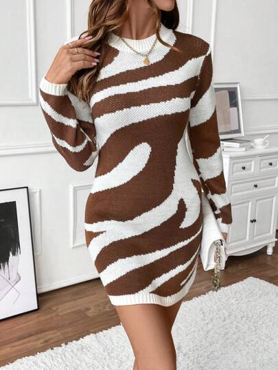 SHEIN LUNE Women's Crew Neck Color Block Fitted Knit Dress - Coffee Brown - View 1