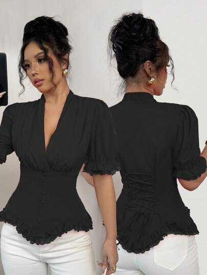 Rafferiza Women's Elegant Red Waist Adjustable Tie-Up Ruffle Lace Panel Square Neck Blouse - Black - View 1