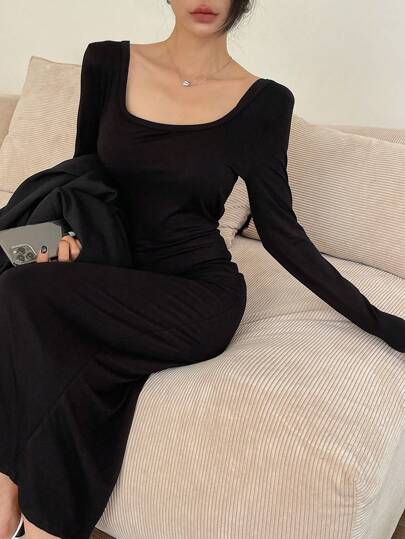 DAZY Women's Fall Black Square Neck Simple Long Dress - Black - View 1