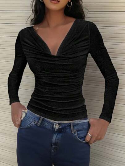 SHEIN EZwear Women's Fashion Ruffle Scoop Neck T-Shirt For Autumn - Black - View 1