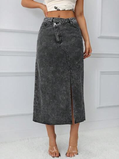 SHEIN Essnce Women's Fashionable Autumn Asymmetric Waist Slit Washed Denim Skirt - Black - View 1