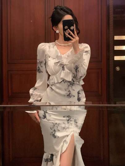 DAZY Women's Floral Print Asymmetric Ruffle Hem Long Sleeve Dress,Fall Dress - Beige - View 1