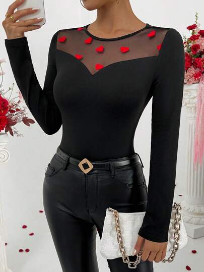 Chiquease Women's Heart Contrast Mesh Panel Crew Neck Long Sleeve Slim Fit T-Shirt - Black - View 1
