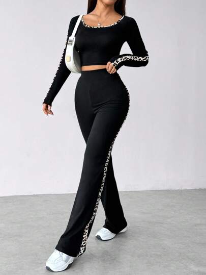 SHEIN Unity Women's Leopard Print Patchwork Long Sleeve Slim Fit Jumpsuit Fall Cloth For Women - Black - View 1