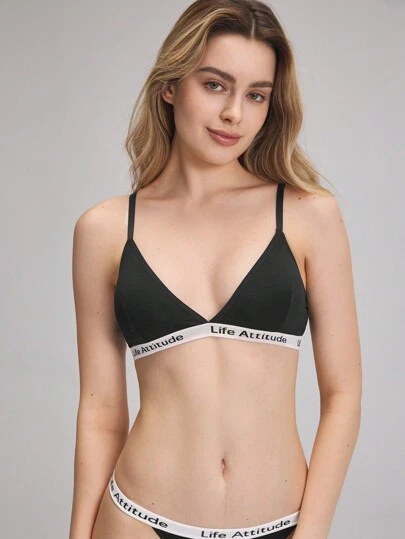 EasyFave Women's Letter Jacquard Ribbon Trimmed Bra With Spaghetti Straps Sports - Black - View 1