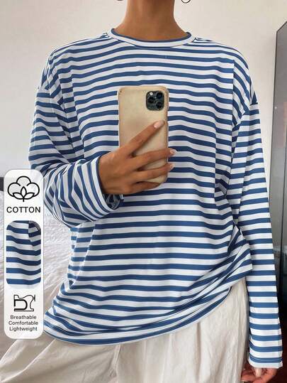 Livesso Women's Loose Fit Solid Color Round Neck Long Sleeve Long T-Shirt - Blue and White - View 1