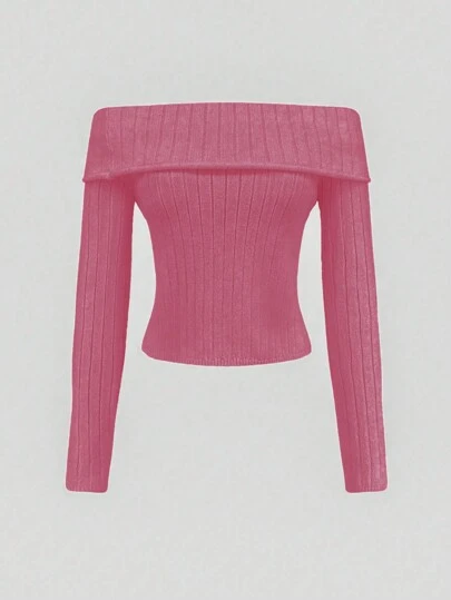 SHEIN Unity Women's Off Shoulder Long Sleeve Ribbed Knit Pullover Fall Winter Sweater - Pink - View 1