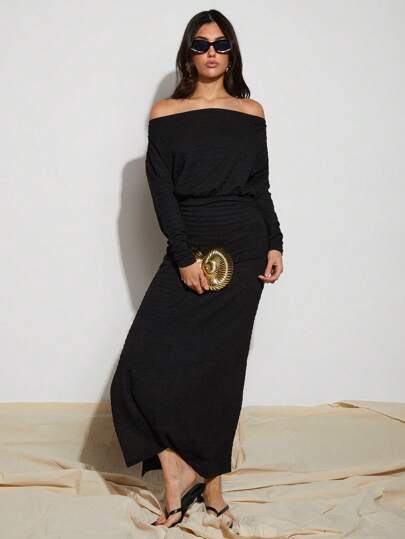 COSMINA Women's Off Shoulder Ruched Waist Side Split Dress - Black - View 1