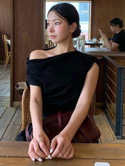 DAZY Women's Off Shoulder Solid Color Short Sleeve T-Shirt, Spring/Summer, Black SpringStyle SpringStyle - Black - View 1