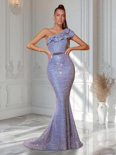 ADYCE Women's One-Shoulder Ruffle Sequin Solid Party Dress - Grey - View 1