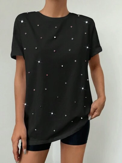RueChic Women's Rhinestone Embellished T-Shirt - Black - View 1