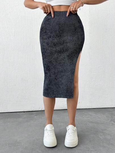 EURMUSE Women's Ribbed Wash Slit Detail Black Skirt - Black - View 1