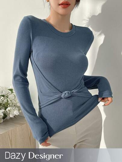 Dazy Designer Women's Round Neck Twist Knot T-Shirt Long Sleeve Women Tops - Blue - View 1