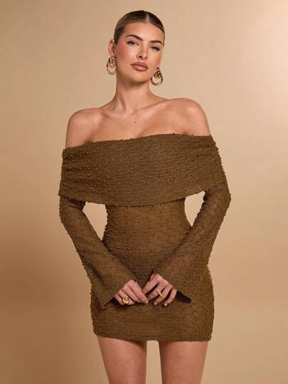 SHEIN BAE Women's Sheer Off Shoulder Tight-Fitting Textured Mini Dress, Brown, Spring/Summer - Brown - View 1