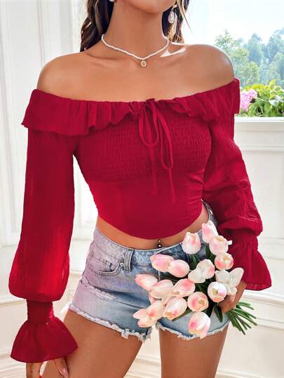 SHEIN Unity Women's Shirred Off The Shoulder Lantern Sleeve Blouse With Ruffled Hem - Red - View 1