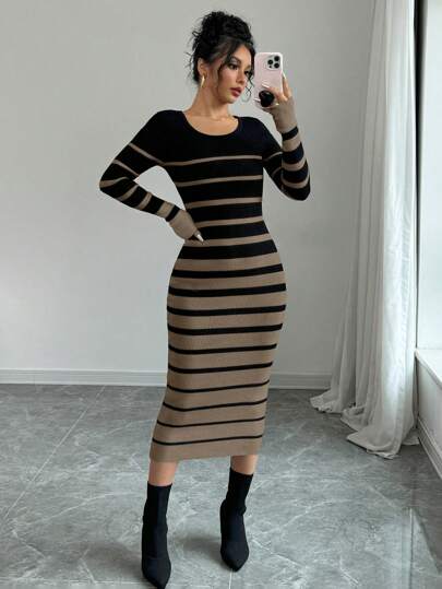 Chiquease Women's Slim Fit Striped Colorblock Long Sleeve Sweater Dress - Mocha Brown - View 1