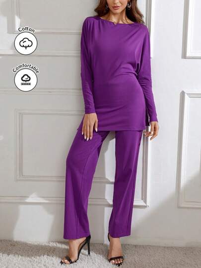 Modelyn Women's Solid Color Boat Neck Long Sleeve Top And Pants Set 2 Pieces Set - Purple - View 1