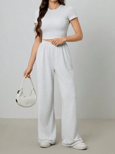SHEIN Tall Women's Solid Color Crew Neck Short Sleeve Slim Fit T-Shirt And Sweatpants Set - Grey - View 1
