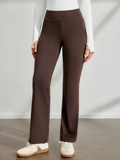 Activina Women's Solid Color High Waist Pocketed Flare Leg Casual Workout Pants - Brown - View 1