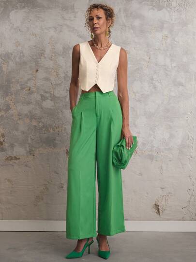 SHEIN Unity Women's Solid Color Pocket Simple Straight Leg Pants, Casual Daily Wear - Green - View 1