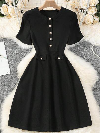 Chiquease Women's Solid Color Round Neck Short Sleeve Single-Breasted Elegant Black Short Dress - Black - View 1