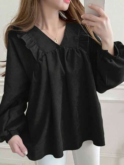 DAZY Women's Solid Color Ruffled Lantern Sleeve Waist Dress, Spring & Autumn,Fall Women Clothes Long Sleeve Top - Black - View 1