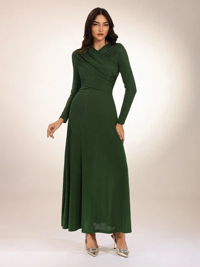 Modelyn Women's Solid Color V-Neck Long Sleeve Pleated Elegant Dress - Olive Green - View 1