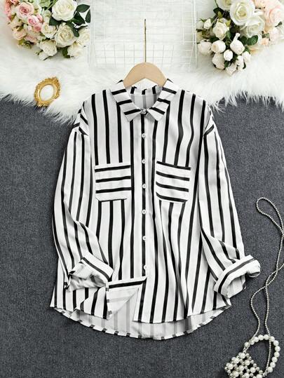 INAWLY Women's Spring & Autumn Loose Striped Long Sleeve Pocket Casual Blouse Women Shirt - Black and White - View 1