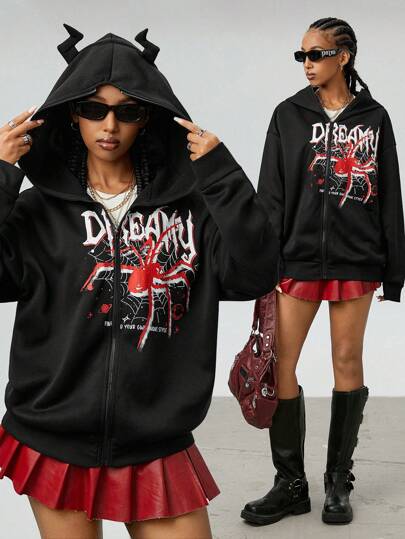 Muchica Women's Spring/Summer Couple Same Style/Going Out/Basic Knit Spider Pattern Zip Up Black Baggy Long Sleeve Hoodies - Black - View 1