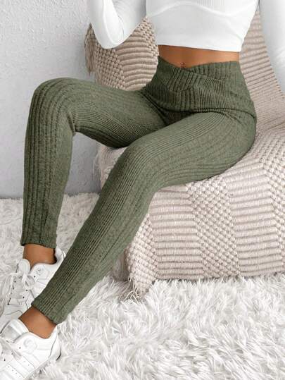 SHEIN Frenchy Women's Stretchy Ribbed Leggings - Army Green - View 1
