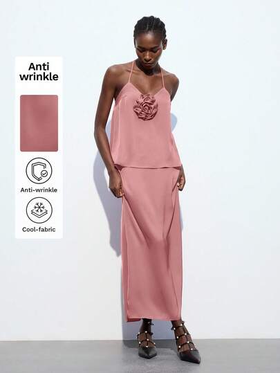 Maija Women's Summer Bubble Gum Pink Floral 3D Decor Tie-Back Tank Top, Casual Business Commute Elegant Vacation Cold Shoulder Top - Pink - View 3