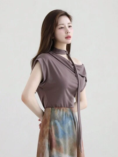 DAZY Women's Summer Solid Color Open Shoulder Lace-Up Fitted Elegant T-Shirt - Brown - View 1