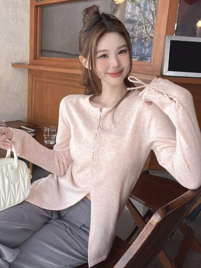 DAZY Women's Tie Cuff Round Neck Cardigan - Pink - View 1