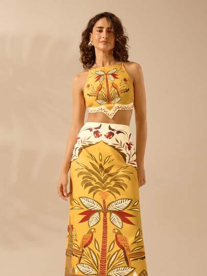 CAJUNI Women's Tropical Boho Resort, Tropical Floral, Coconut Tree And Toucan Apricot And Yellow Print, Double Side Split Skirt - Multicolor - View 1