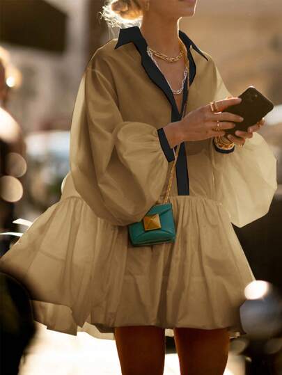 SHEIN Essnce Women's White Ruched Button-Up Shirt Dress With Long Sleeves, Mini Length - Khaki - View 1