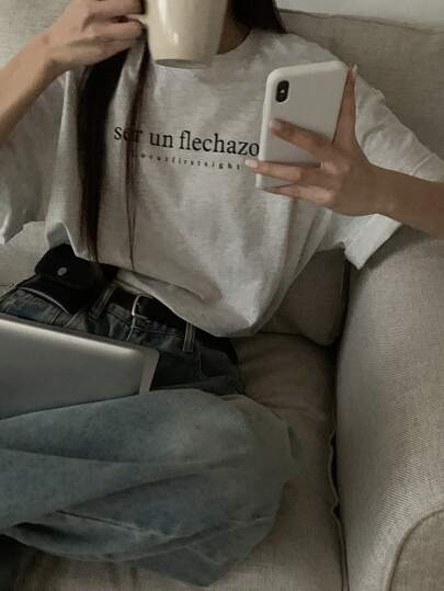 DAZY Women & Teenage Girls Casual Round Neck Loose Letter Print T-Shirt - Grey - View 1
