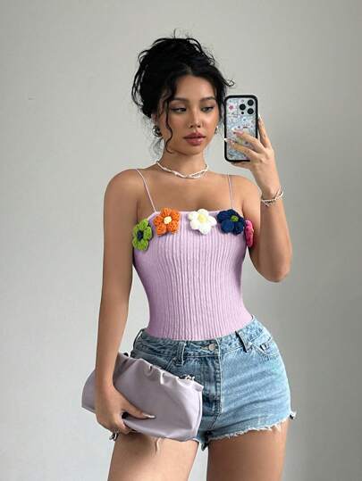 Chiquease Women 3D Flower Cami Bodysuit - Mauve Purple - View 1