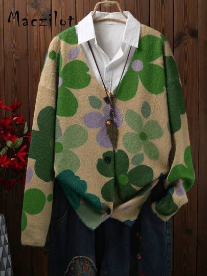 Women Casual Loose Knitted Printed Mink Velvet V-Neck Button Cardigan Sweater Short Jacket - Multicolor - View 1