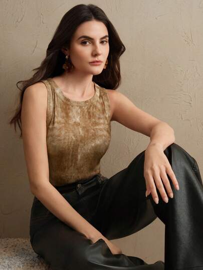 Anewsta Women Distressed Ribbed Crew Neck Tank Top - Brown - View 1